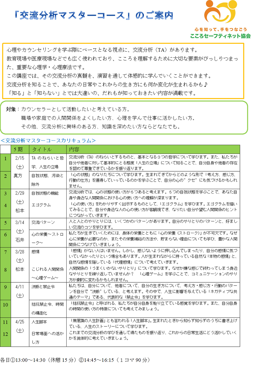 今回ご出席いただいた方も、そうでない方も、「もっと深く理解したい」と思われた方は、ぜひ<交流分析マスター講座>の受講もご検討ください。
